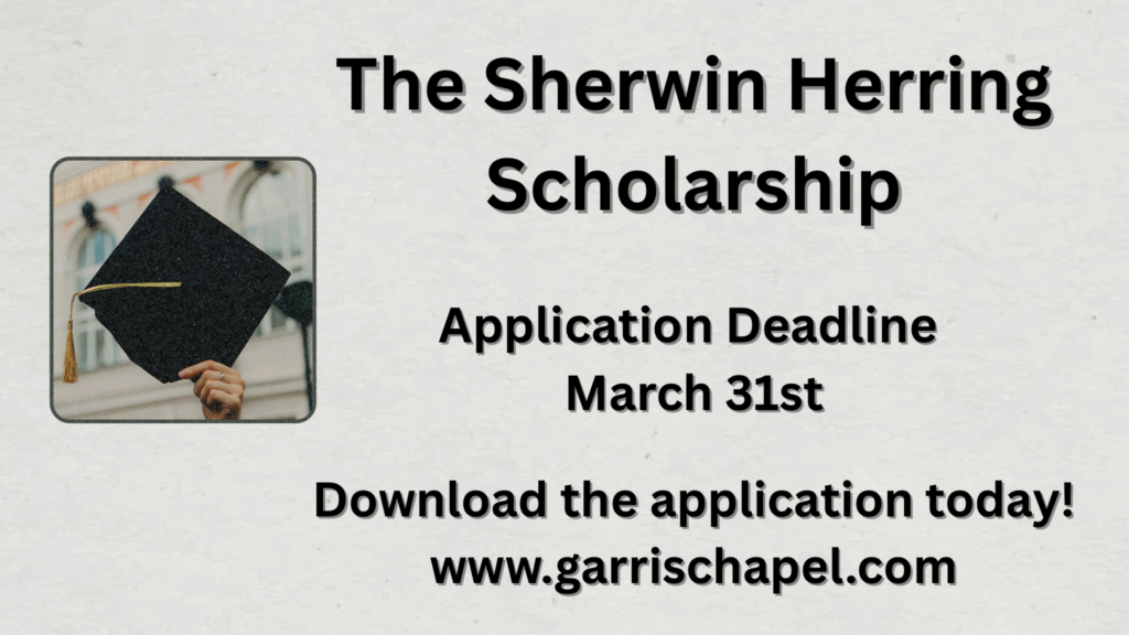 A scholarship opportunity has been established by The Sherwin Herring Scholarship Fund to award $2,500 / scholarship to qualifying graduates who are active members of Garris Chapel. This scholarship is to help the students